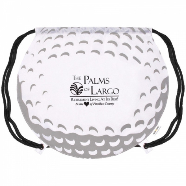 ::Unique alternative to the basic cinch up backpack.::Our exclusive GameTime! sports bags are available in 8 patented sports shapes with the same durability and reliability of the classic drawstring bag.::Golf ball dimple stock art comes pre-printed on the front of each bag.Add your logo or message for an exciting and professional giveaway or promotion.::Made of 210D Polyester and features grommeted adjustable soft black Nylon shoulder strap doubles as drawstring closure.::Recommended weight tolerance: 6.5 lbs.
