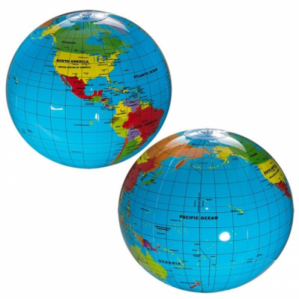 ::14" vinyl inflatable beach toy with full globe printed on panels.::Map is not to scale. ::Not intended for use as an educational tool.::Measurement is 1/2 the circumference when item is inflated.::For novelty use only - accuracy of country, state, or city information is not guaranteed.::NOTE: Imprint available on one side only - on Pacific Ocean. ::NOTE: Orders with detailed registration may necessitate a reduced imprint area for accurate reproduction.WARNING: CHOKING HAZARD - small parts. Not intended for children under the age of 3.