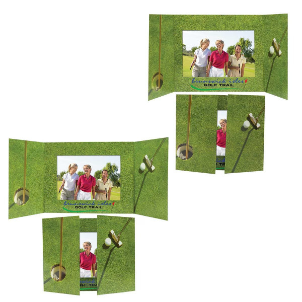 Capture memorable moments from the course with this golf-themed photo mount, designed to showcase a favorite tournament or outing photo in a fun and professional display. This foldable mount opens to reveal a standard photograph, creating an attractive presentation that highlights a special golf memory while keeping the photo protected. When closed, the mount offers a clean, polished look, and when opened it provides a larger display area that frames the image with a golf-inspired design. Crafted from sturdy paper material, it offers a lightweight yet durable way to preserve photos from tournaments, charity outings, and corporate golf events. This item also works well as a promotional product that can be custom branded with a logo, message, or event name, making it an ideal keepsake for participants, sponsors, and guests who want a lasting reminder of the day on the course.