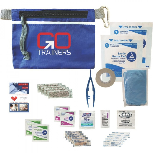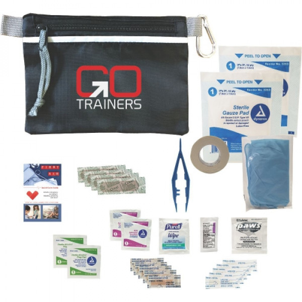 ::Kit includes: 1 First Aid Basics Guide, 1 Antimicrobial Wipe, 1 Tweezer, 1 Triple Antibiotic Ointment 0.5g, 1 Roll Medical Tape, 1 Pair Nitrile Gloves, 2 Gauze Pads 3x3, 4 Bandages, 5 Junior Bandages, 5 Butterfly Bandages, 1 Antibacterial Wipe ::2 Alcohol Pads, 2 Antiseptic Wipes ::Get more people to come to you first when you give out this Grab-N-Go first aid kit!
