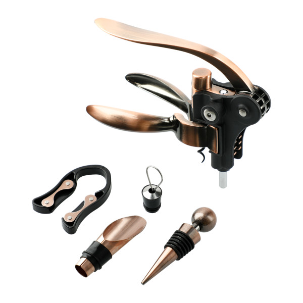Includes an ergonomic bottle opener, foil seal cutter, drip ring, thermometer, pourer, two wine stoppers and two replacement corkscrew bits.Details