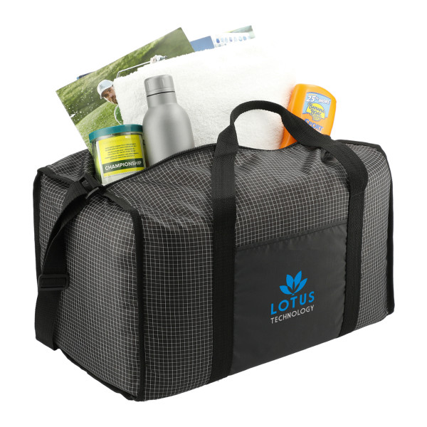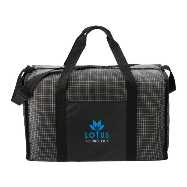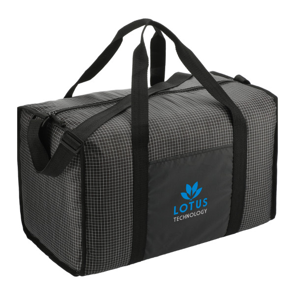 The Grid Boxy Duffel features a roomy zippered main compartment, two carry handles, and an adjustable shoulder strap.