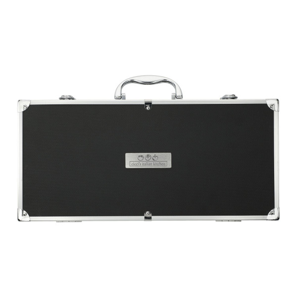 ::This 13-piece BBQ set includes everything needed to be king or queen of the backyard grill - spatula, tongs, knife, fork, four skewers, and four corn holders, all in an aluminum accented case. ::Handles are plastic with stainless steel grip to prevent heat transfer. ::For the skewers this allows you to hold the handles and have full control basting food and perfecting the amount of charring you want. ::Do not expose the handles to direct heat or use in broiler.