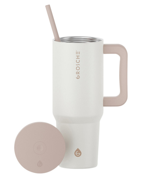 The Grosche Aspen 40oz Insulated Tumbler with Handle in Cream White is a stylish and practical solution for on-the-go hydration. Crafted from durable 18/8 stainless steel, this tumbler features triple-wall insulation to keep your beverages cold for up to 30 hours and ice intact for up to 48 hours. Its spill-resistant half-turn lid ensures easy access while preventing leaks, and the cupholder-friendly design makes it perfect for travel. Included are two straws and a cleaning brush for added convenience. Plus, every purchase supports the GROSCHE Safe Water Project, providing 50+ days of safe drinking water to someone in need.