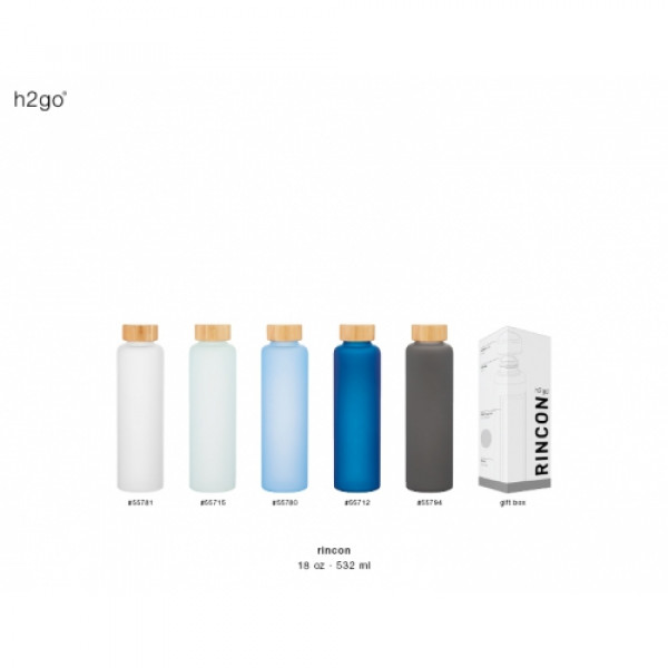 The h2go Rincon 18 oz glass bottle is a sleek, eco-friendly promotional product that can be custom branded to highlight your message or logo. Crafted from lightweight borosilicate glass, it features a soft-touch translucent finish for a comfortable grip and a natural bamboo lid for a stylish accent. Perfect for cold beverages, this bottle is ideal for sustainable hydration at the office, gym, or on the go.