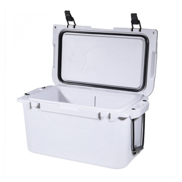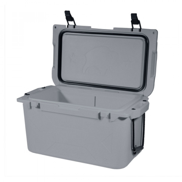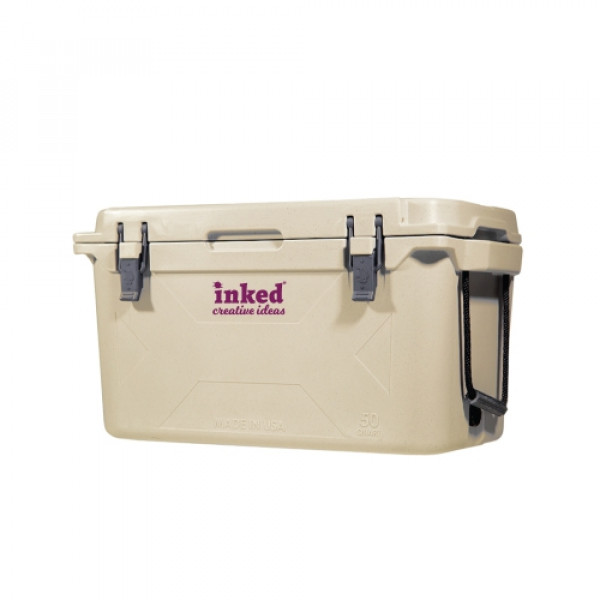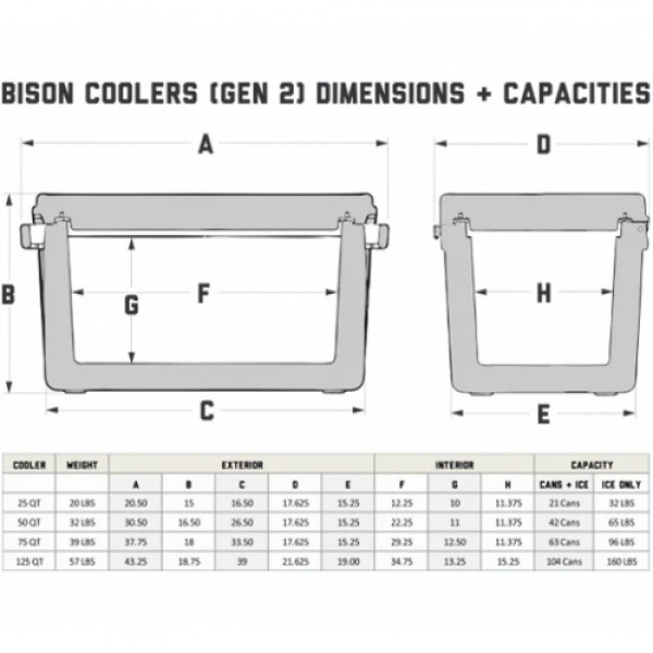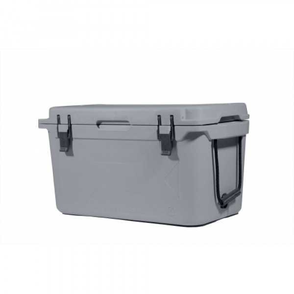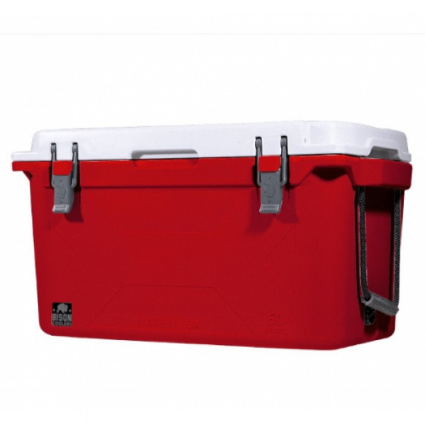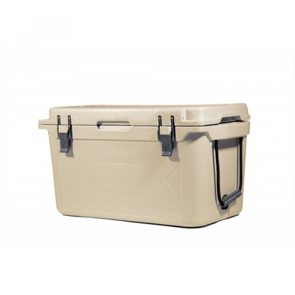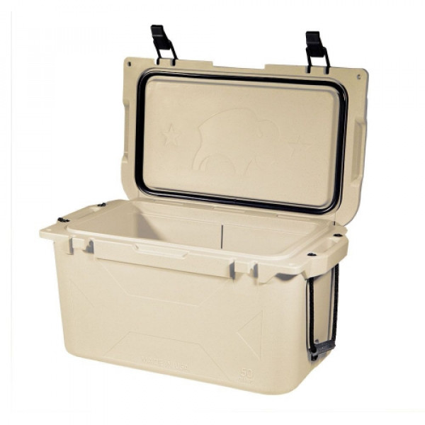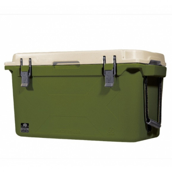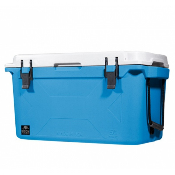 You don't want a fragile toolbox, a wimpy pickup truck, or delicate work boots, so why would you settle for an everyday cooler that can't handle your lifestyle? Whether you're looking for a hunting cooler, a fishing cooler, a camping cooler, a tailgating cooler, or a boating cooler, you need a rotomolded ice chest that keeps things cold (Duh!) and that tolerates a little bit of banging around (on the ATV, in the boat, in the back of the truck, at the campsite, and -- let's be honest -- in your garage).Bison's 50 qt. cooler doesn't require "gentle hands" when loading or unloading, doesn't need new ice every couple of hours, and doesn't come from a manufacturing plant overseas. You shouldn't have to buy a premium rotomolded cooler made anywhere other than in the United States.::Made in the USA to support fellow Americans.::Constructed as one piece, Bison rotomolded coolers won't fall to pieces.::Drinks stays cold and food stays fresh inside two-inch thick insulated cooler walls.::Silicone, shark-fin gasket seals cold air inside the ice chest.::Oversized drain plug makes for easier cooler cleaning.::Rope handles provide a more comfortable grip.::Durable latches keep the lid shut tight and nosy critters out.::Skid-preventing rubber feet means your Bison stays where you put it.::Lockable lid prevents strangers from helping themselves to your beer.::Customizable lid shows off your personality.::Easy to strap down for bumpy roads on the back of an ATV.::Your long-lasting cooler investment is backed by a 5-year warranty.::Capacity: 42 12-oz. cans at a 2:1 ice-to-drink ratio or 65 lbs. of ice