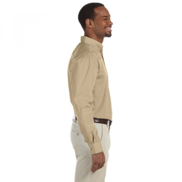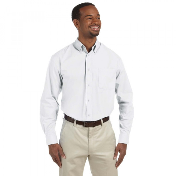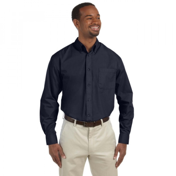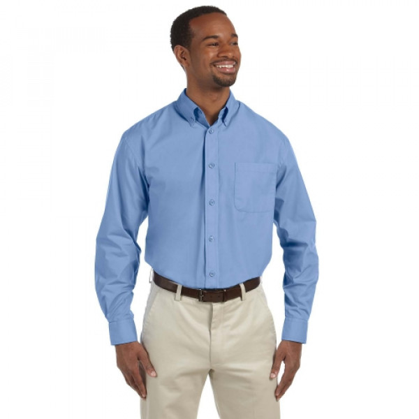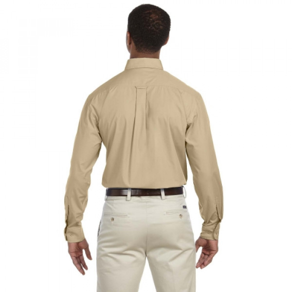::65% polyester, 35% cotton poplin::Extra stitching at seams and buttons::Flat-felled seam finishing::DTM buttons::Full back yoke and back box pleat::Left-chest pocket::Button-down collar::Two-button adjustable cuffs