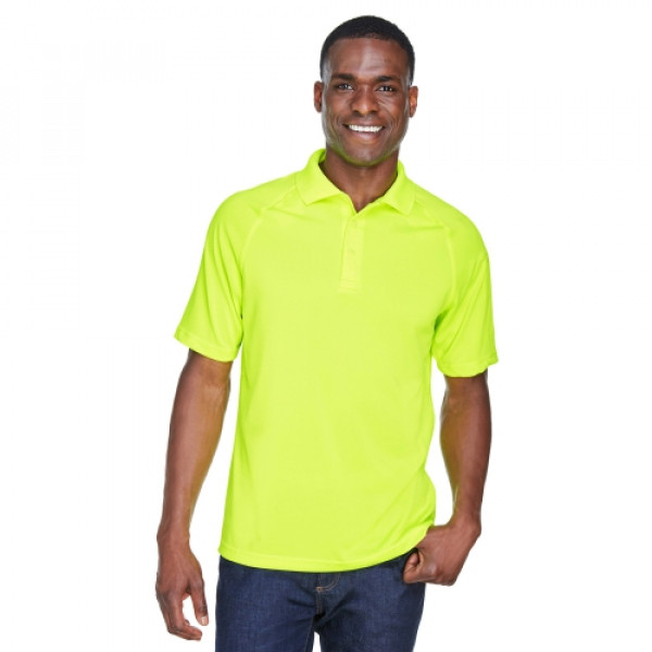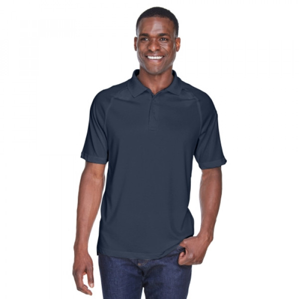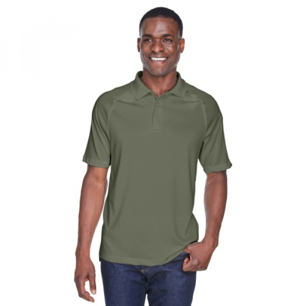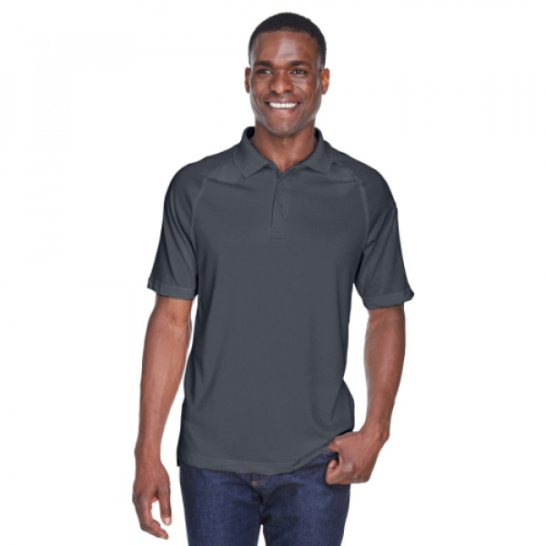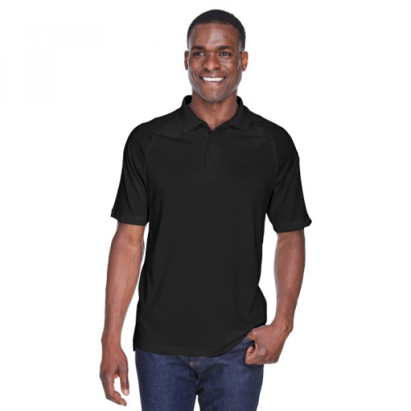 Fabric:::6.6 oz. / 225 gsm, 100% polyester snag-protection plus jersey::Moisture-wicking and anti-microbial performanceFeatures:::matching flat knit collar::three-button placket::double pen pocket on left sleeve::mic clips at shoulders and lower placket::1 1/4" drop-tail hem for everyday activity and movement::side slits