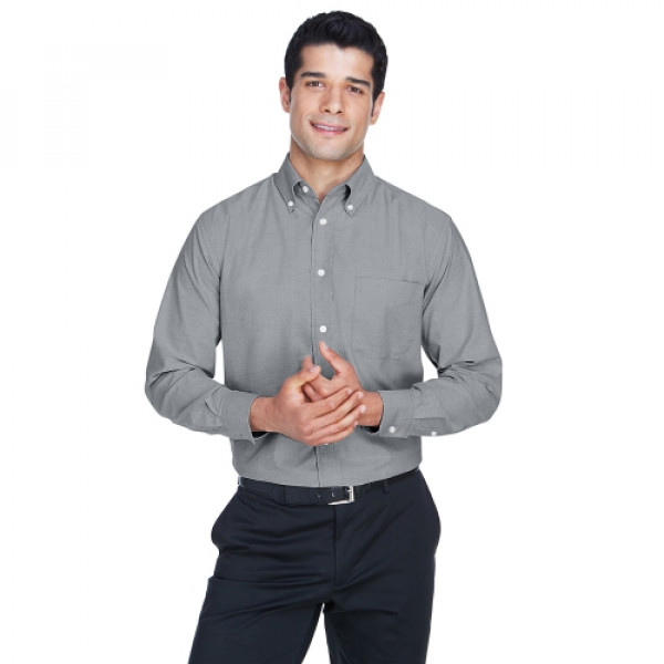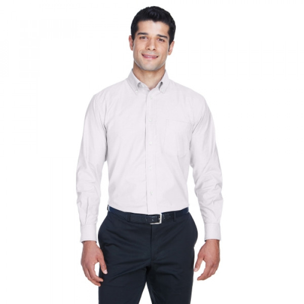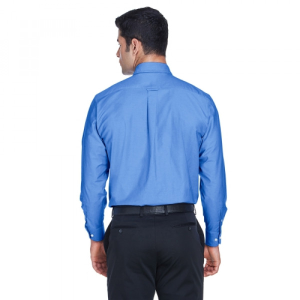 ::65% cotton, 35% polyester with stain-release::Easy-care, wrinkle-resistant::Extra stitching at seams and buttons::Flat-felled seam finishing::Pearlized buttons with Harriton logo::Full back yoke and back pleat::Left-chest pocket::Two-button adjustable cuffs::Button-down collar