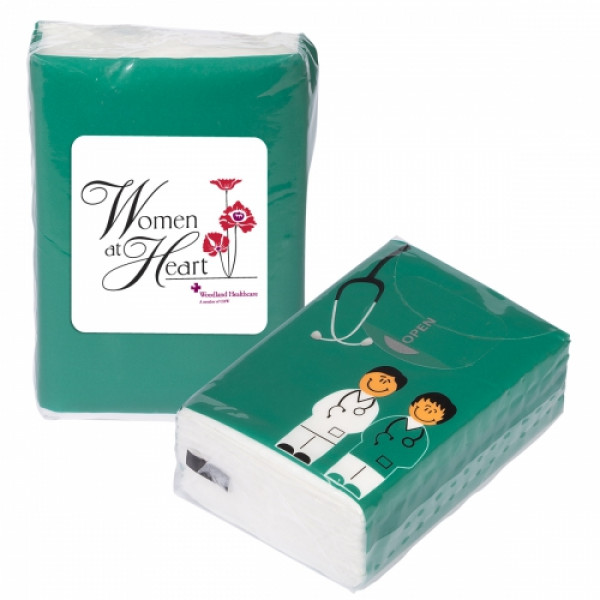 ::Pocket size PE Plastic tissue pack with doctor and nurse medical stock art on front. ::Features re-sealable backside closure. ::Includes ten 3-ply virgin pulp tissues (not refillable)