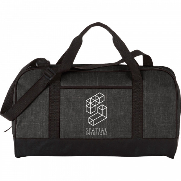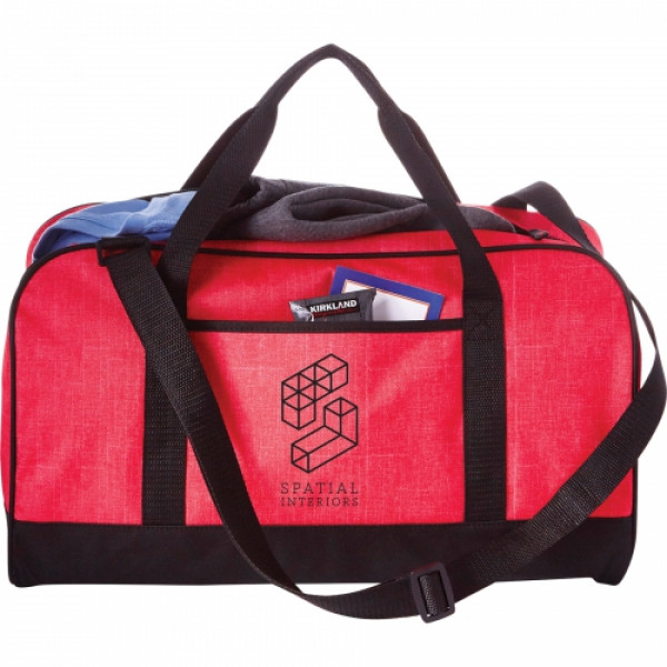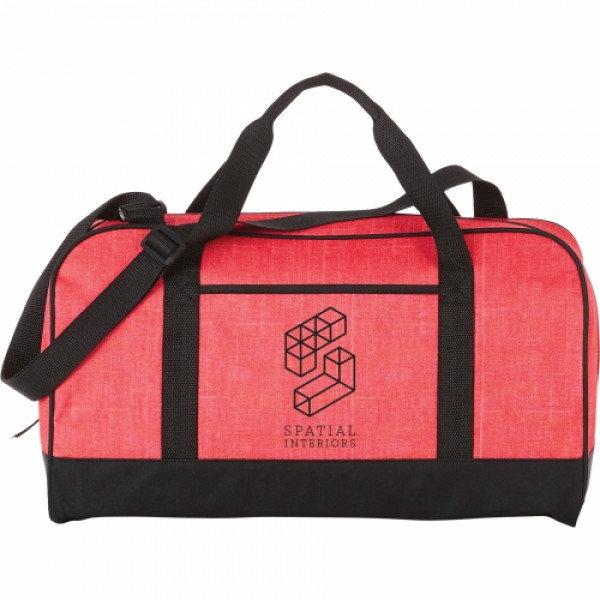 The Heather 18" Duffel Bag has a zippered main compartment and an open front pocket plus an adjustable shoulder strap and dual carry handles. ::Disclaimer: There may be minor variations in color of the actual product due to the nature of the fabric dyes weaves and printing.