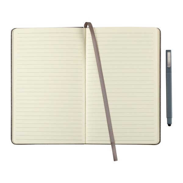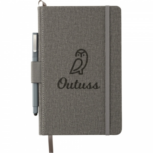 ::Heathered PU hard cover bound journal. <br />::Color matching elastic pen loop on spine, color matching elastic closure and ribbon page marker. <br />::80 sheets of cream lined paper with color matching painted edges.<br />::Pen not included.