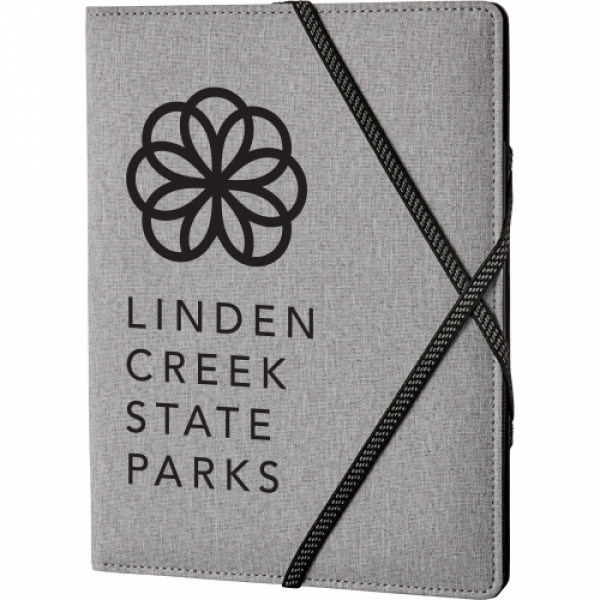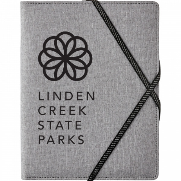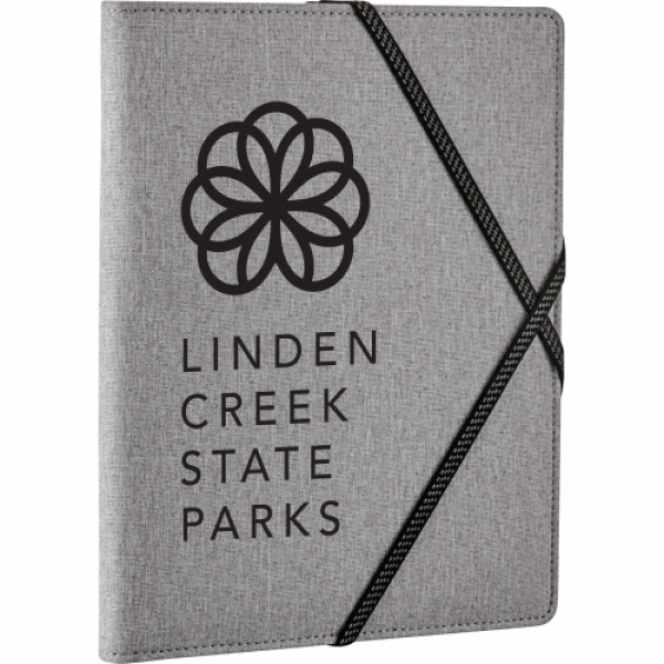 The Heathered Writing Pad features a fabric cover with interior organization for business cards, document pocket and pen loop. Exterior organization on back cover equipped with elastic strap closure. Writing pad has 20 sheets.