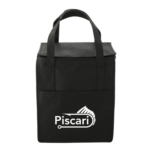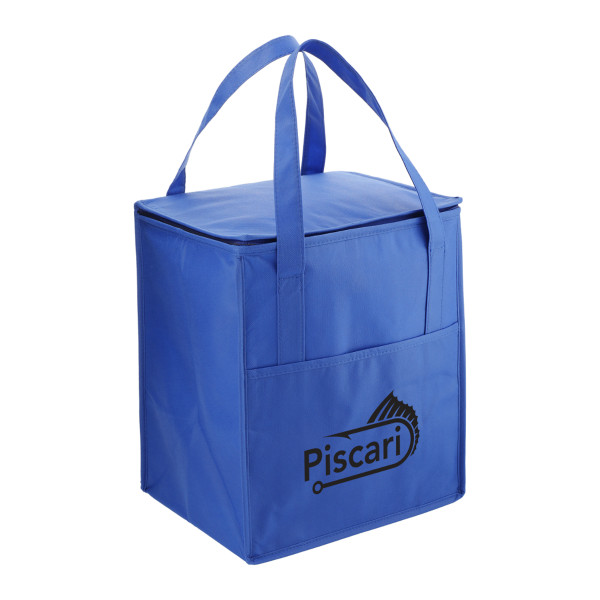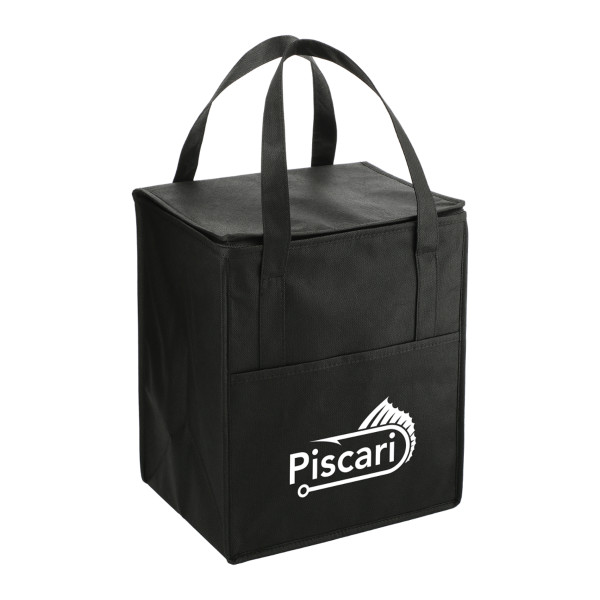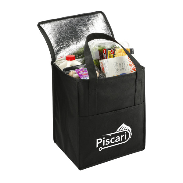 The Hercules Flat Top Insulated Grocery Tote features a large open main compartment and front slash pocket, plus a zippered closure and 22 pound weight capacity.