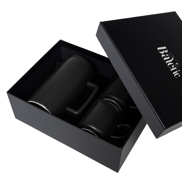 - Includes two 12 oz. (250 ml) matching black porcelain mugs