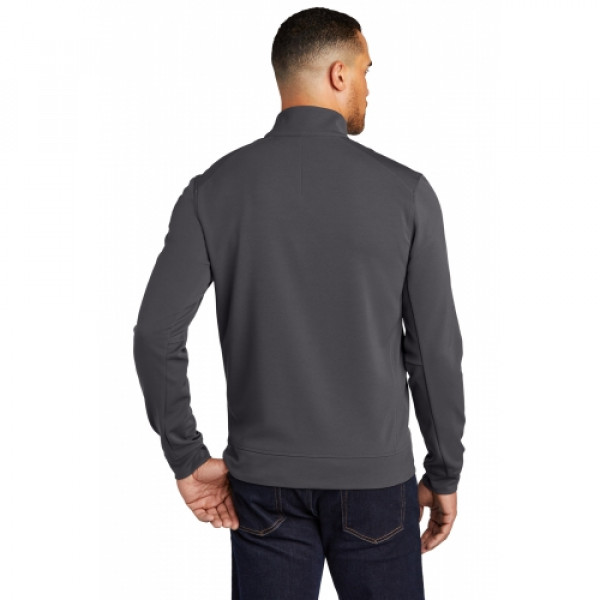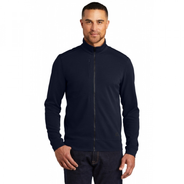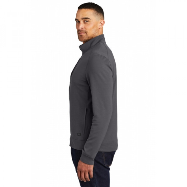 When your style hinges on looking sophisticated and modern, this subtly textured jacket hits the mark.::6-ounce, 100% poly ::OGIO heat transfer label for tag-free comfort::Cadet collar::Exposed polished molded zipper with locking zipper pull ::Left chest pocket with hidden zipper::Black reflective O heat transfer on front left hem