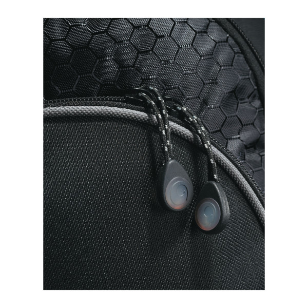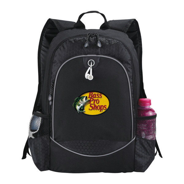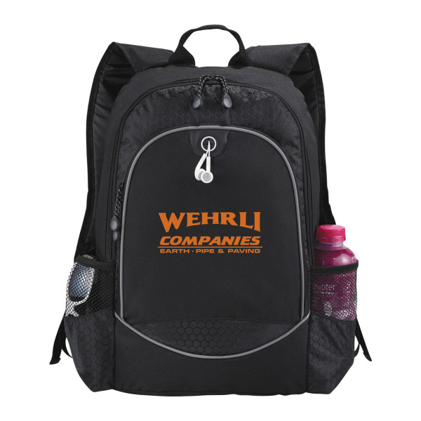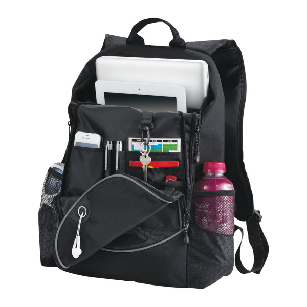 ::The Hive 15" Computer Backpack features a zippered main compartment that olds your laptop and includes a padded compartment for your iPad® or tablet. ::Large front zippered pocket has organization and earbud access. ::Features two side pockets and adjustable backpack straps and carry handle.