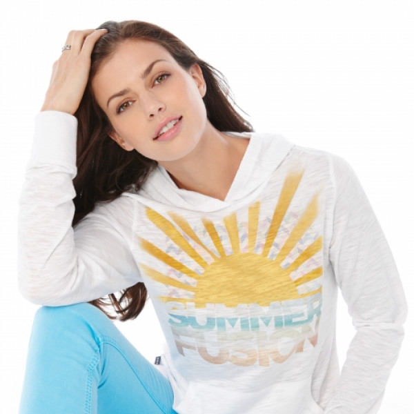 Get undercover in the Howson Ladies Knit Hoody for just-enough warmth on cooler days and nights. The Ladies Howson features a front pouch, interior media pocket and sleeve cuffs with a thumb exit. Available in 5 bold colors, this hoody plays the part in corporate, team, resort, uniform or as an every day light hoody. ::Tailored for a woman's form::Decorate with the new InFusion decoration for maximum brand exposure! ::One decoration cost for full color logos!! ::Available in 5 fresh colors, this tee will enhance your brand::Decorate with the new inFusion decoration for maximum brand exposure from seam to seam.::Multiple decoration locations available- please call for details.