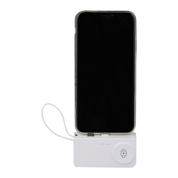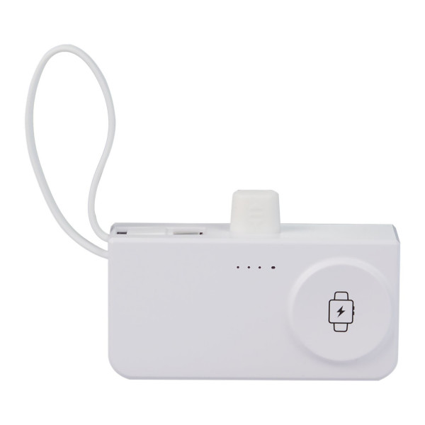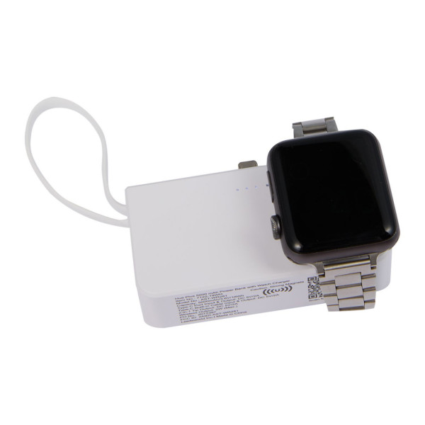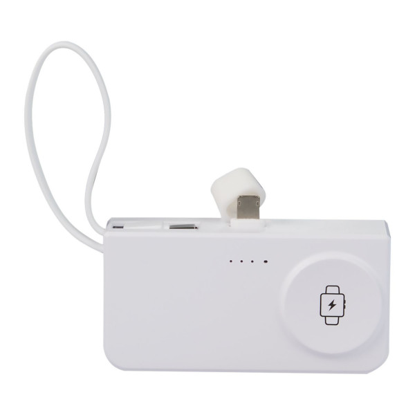 The Hue 5000 Power Bank with iWatch Charger features a 5,000 mAh/18Wh rechargeable lithium polymer battery, an integrated 5.5-inch cable with Type-C Input/Output tip as a lanyard and 2-in-1 dual compatible fixed tip for Apple® iOS devices and Android devices with Micro input. Type-C Input/Output Tip: 5V/2A (10W); Type-C Input/Output Port: 5V/2A (10W); 2-in-1 Output Tip: 5V/2A (10W). It also supports wireless charging at up to 2W for Apple Watch 1 to 10. The power bank itself can be recharged through integrated cable with Type-C tip or your own Type-C cable. Power banks are permitted in carry-on luggage only, and at the discretion of TSA agents. Please charge the power bank before initial use.