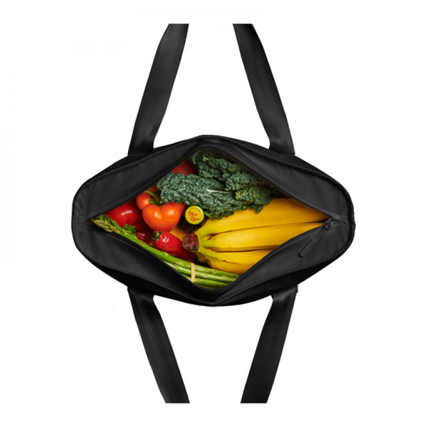 Large insulated tote keeps food fresh for hours. Main body fabric is made of 100% recycled polyester with a durable coating. Fully-lined and leakproof interior for easy cleaning. Collapsible design for quick storage and travel. Robust base for unsupported self-standing. Water-resistant zippers keep moisture out. Outer pocket for quick access to extras. FDA food grade BPA-free liner with welded seams keep spills and splashes contained. Designed for Good: This product was designed and developed with the well-being of people and planet in mind. Care & Use: Avoid sharp objects that may damage the item Remove surface and interior spills with a damp sponge and warm water. Do not use detergents or cleaning agents containing bleach. Leave open to dry.
