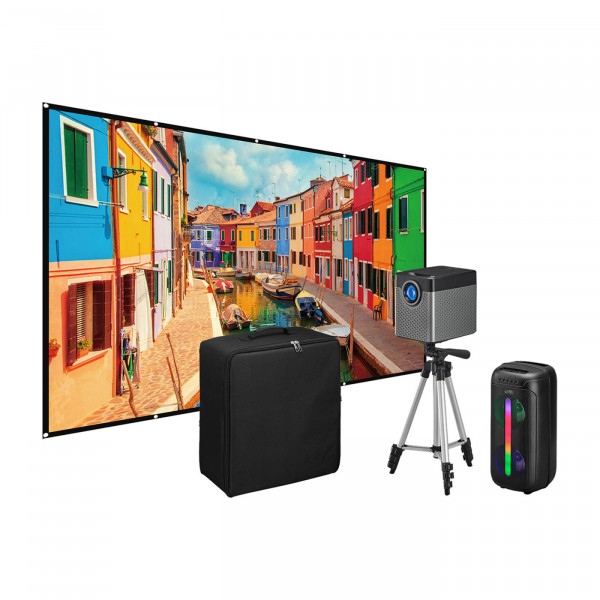 - Complete set with projector, 42" tripod, 8W Bluetooth® speaker, and 120" screen