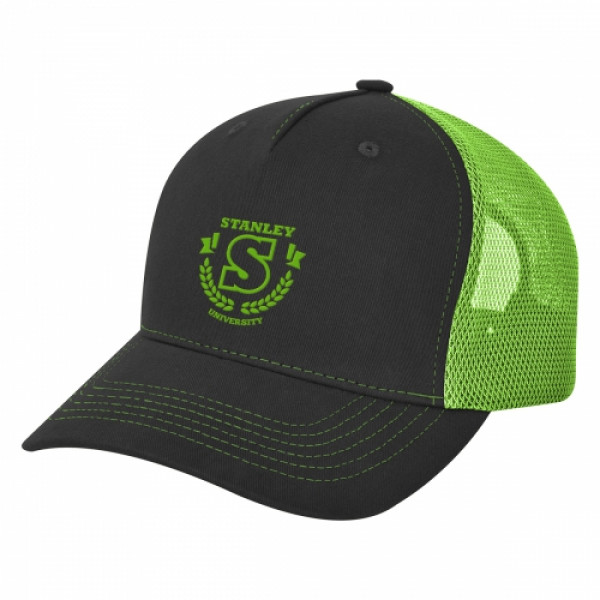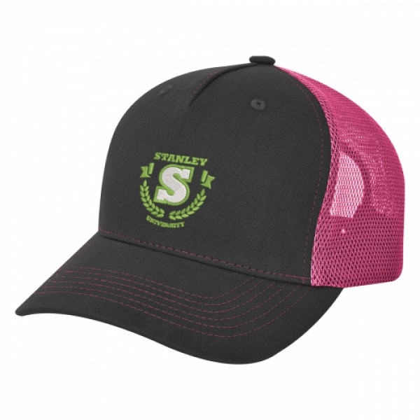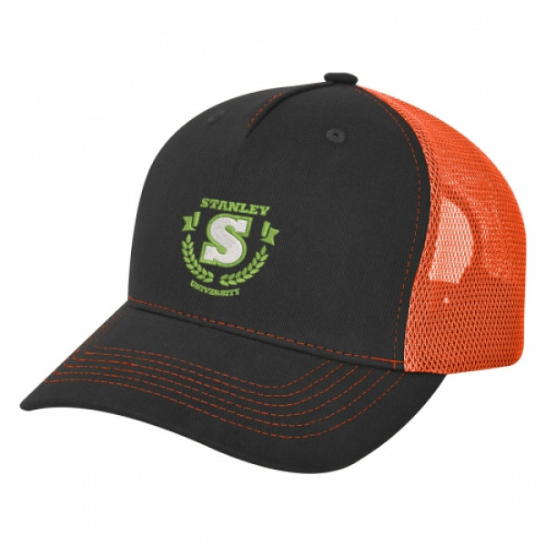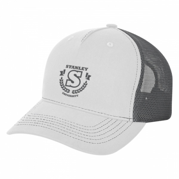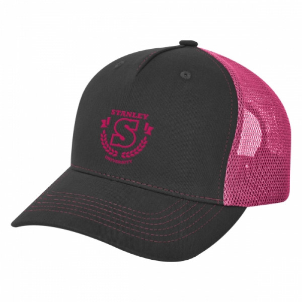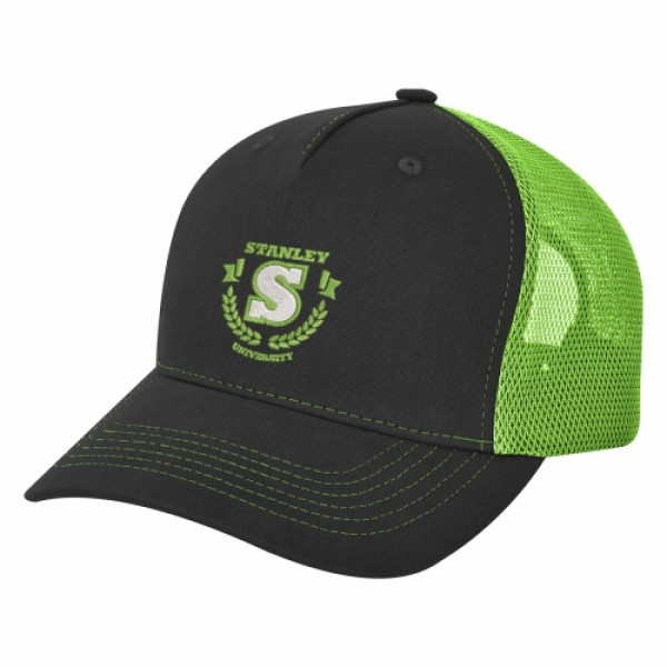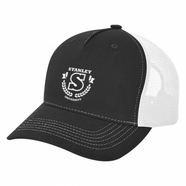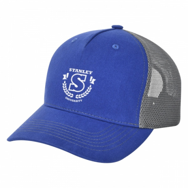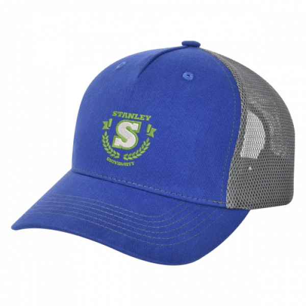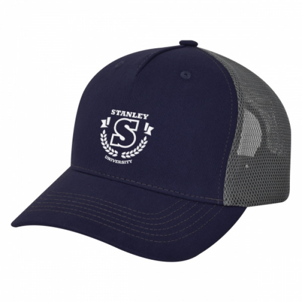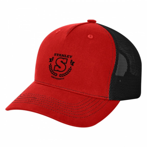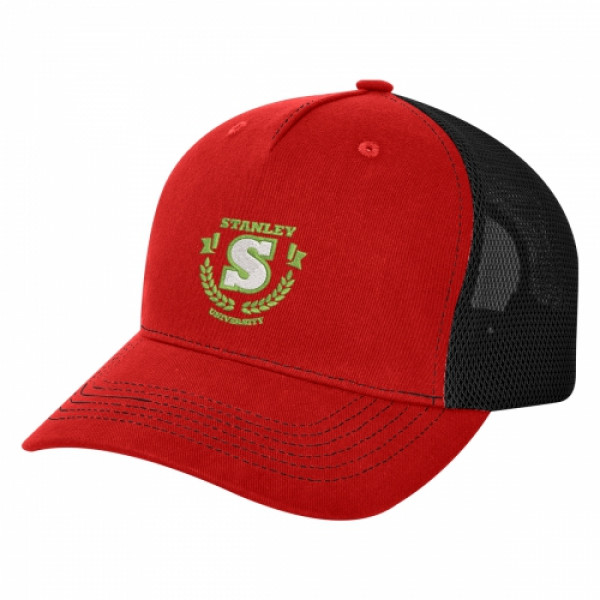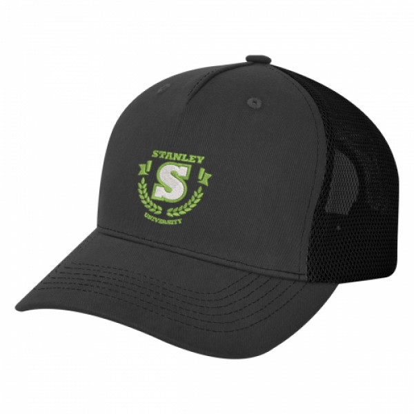 ::70% Cotton, 30% Polyester::5 Panel, Medium Profile::Structured Crown & Pre-Curved Visor::Mesh Back With Adjustable Plastic Snap Tab Closure