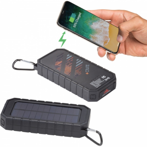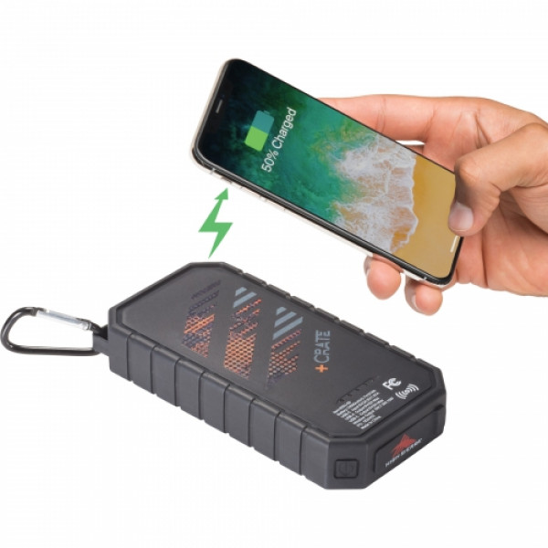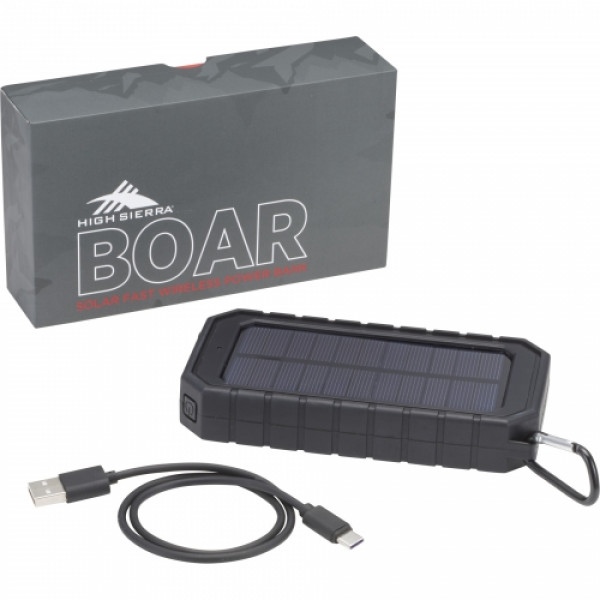 Introducing the High Sierra IPX 5 Solar Fast Wireless Power Bank - the ultimate accessory for on-the-go charging! With its 10000 mAh rechargeable battery, this power bank can wirelessly charge your phone or serve as a regular power bank. And guess what? It even has a solar panel and flashlight, making it perfect for outdoor adventures. Plus, the included carabiner lets you easily attach it to your bag. It's compatible with any smartphone or tablet, and works with most phone cases too. Get ready for hassle-free charging wherever you are!