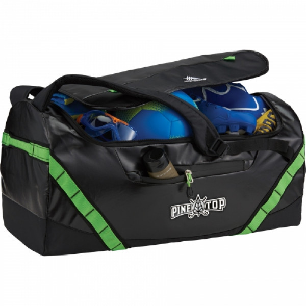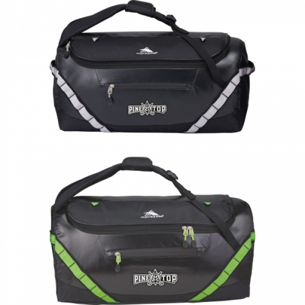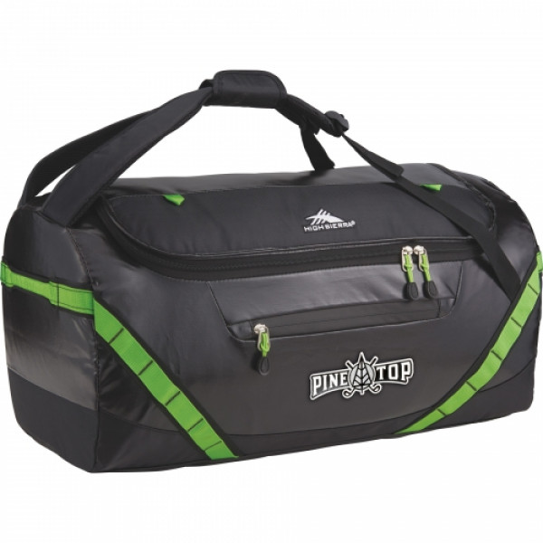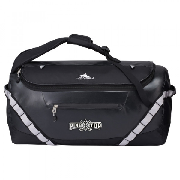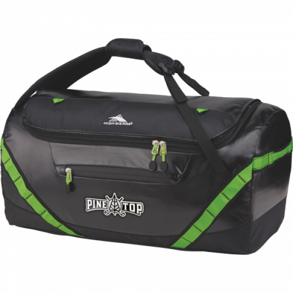 ::The High Sierra Kennesaw 24” Sport Duffel can be carried as a duffel or a backpack. ::This versatile duffel is made from durable and lightweight coated water resistant fabric.::Organize your belongings easily in the large main compartment, interior zippered mesh pocket and front zippered accessory pocket. ::This duffel also features a front panel daisy chain for attaching gear and convenient grab handles on top and side.