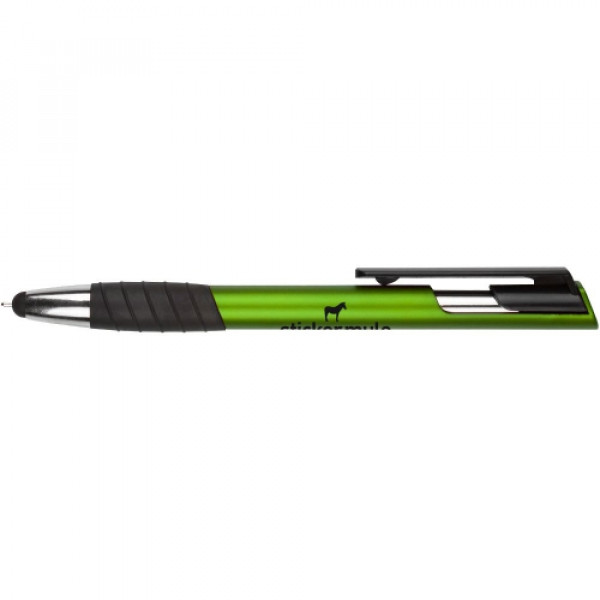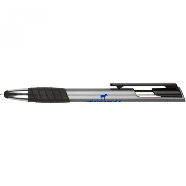 ::Rubber grip with attractive ribbing::Barrel is medium-width::Super Glide refill provides an exceptional writing experience::Stylus and pen tip are combined::Push the plunger to create a gap where you snugly fit your phone. Voila! A stand::Architectural design with an angled plane as the top of the plunger