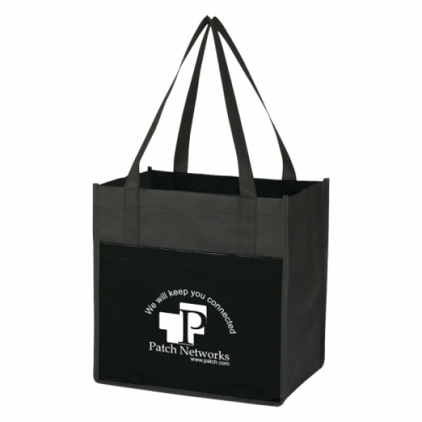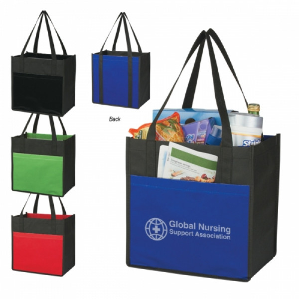 ::Made Of Combo: 80 Gram Non-Woven And 110 Gram Laminated Non-Woven, Coated ::Water-Resistant Polypropylene::Large Front Pocket::Great For Grocery Stores, Markets, Book Stores, Etc.::8" Gusset With Bottom Insert::Reusable::Recyclable::21" Handles::Spot Clean/Air Dry