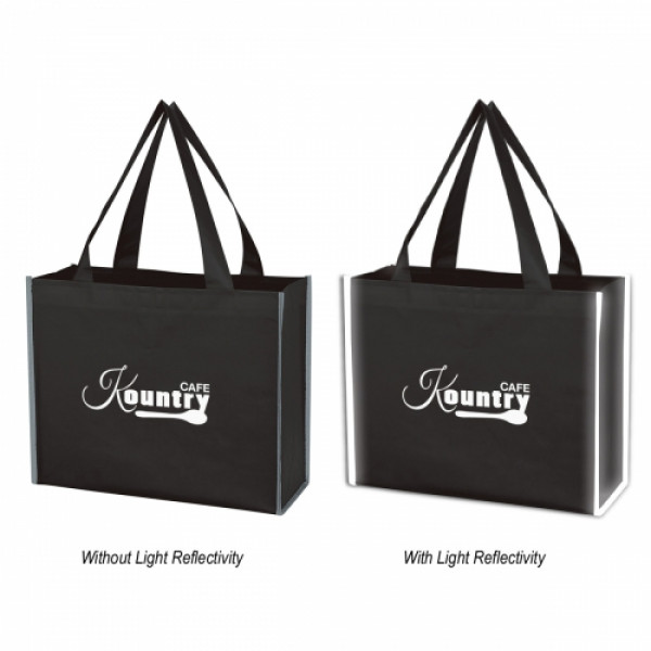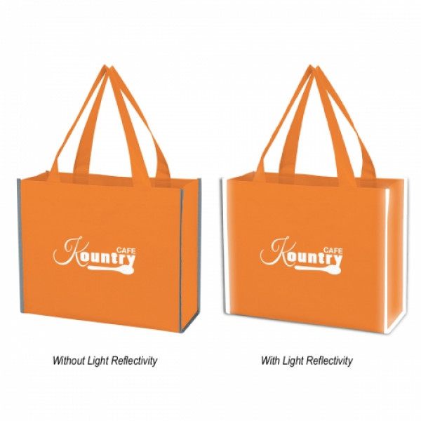 ::Made Of 80 Gram Laminated Non-Woven, Coated Water-Resistant Polypropylene::Patented Reflective Piping Accents::Great For Grocery Stores, Markets, Book Stores, Etc.::6" Gusset::Reusable::Recyclable::24" Handles::Spot Clean/Air Dry
