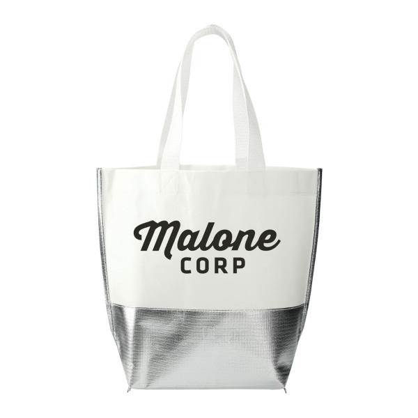 Water-resistant laminated material Large open main compartment Metallic bottom panel accent Webbed 10" drop handles Reusable