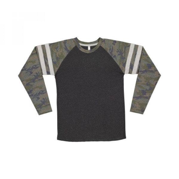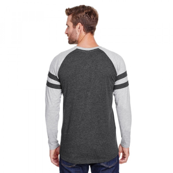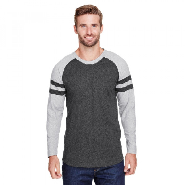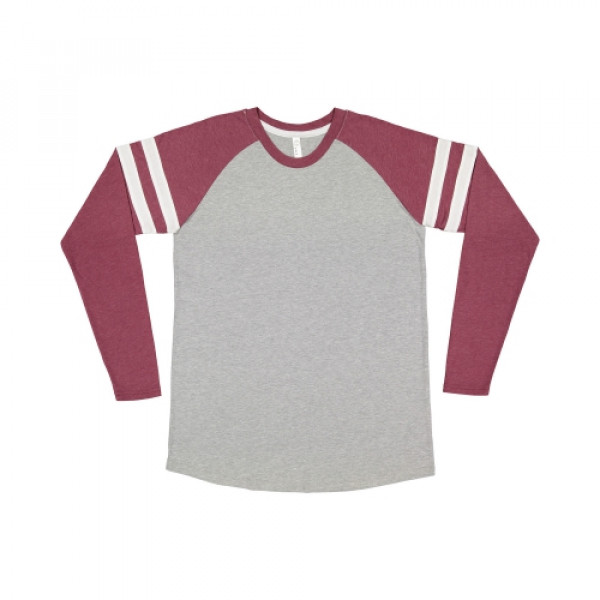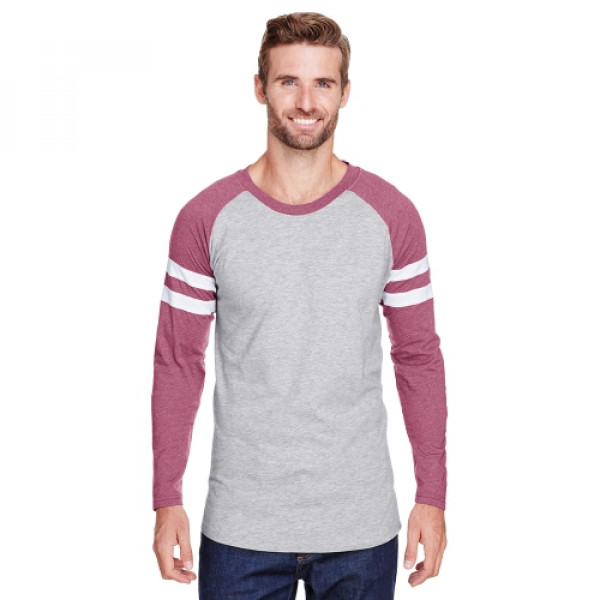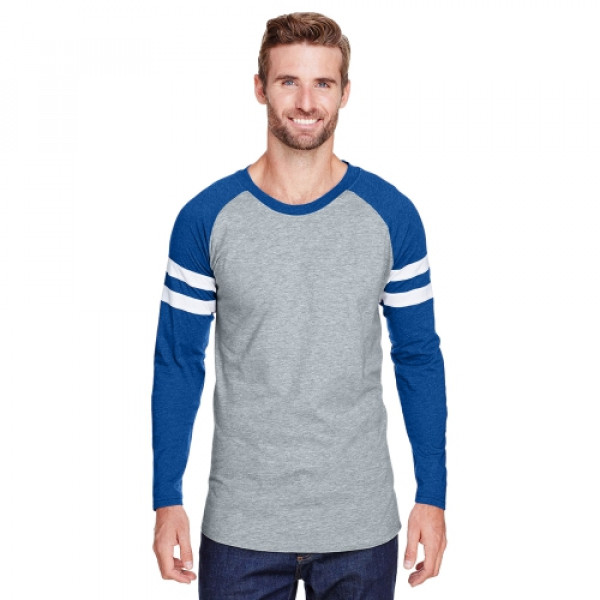 Fabric:::4.5 oz., 60% combed ringspun cotton/ 40% polyester fine jerseyFeatures:::Self-fabric collar binding and back neck tape::Contrast topstitched self-fabric sleeve stripes::Double needle sleeves and rounded bottom hem::Side seam construction::EasyTear™ label::Machine washable/ tumble dry low::Fit: Adult Unisex - True to Size::Note: Color descriptions indicate Body/Neck and Sleeves/Stripe colors, e.g. Blended ::White/Vintage Smoke/Blended White indicates Blended White shirt with Vintage Smoke neck and sleeves with Blended White stripes.