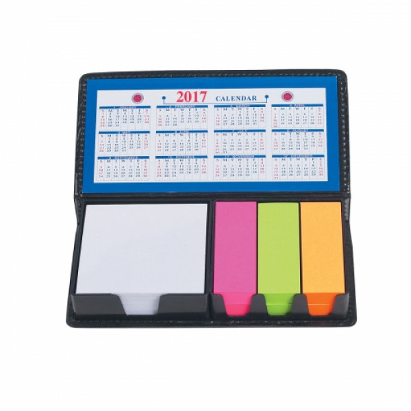Keep notes, reminders, and dates close at hand with this professional-style leather-look case—an elegant and useful desk companion. It includes sticky notes, neon flags, and a calendar built into the cover, making it a functional promotional product that can be custom-decorated or branded to keep your message front and center.