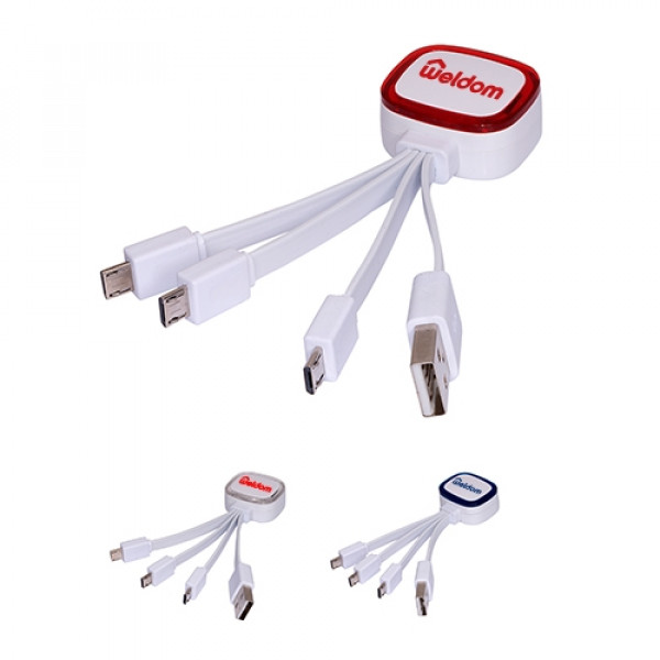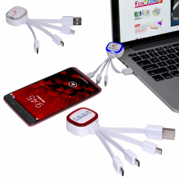 The Light Up Adapter can charge 3 devices at one time! Stay charged and connected with this handy techie accessory! The Light Up Adapter is a great trade show giveaway! ::ABS plastic cable adapter with one standard USB plug connecting to three micro USB plugs ::Charge up to 3 devices at once ::Unit lights up when plugged in::Choose from 3 colors::Requires additional adaptor to connect to Apple devices