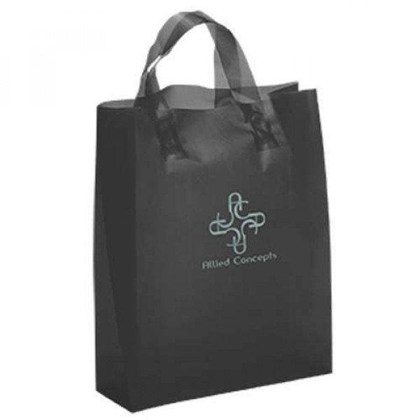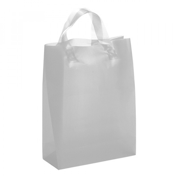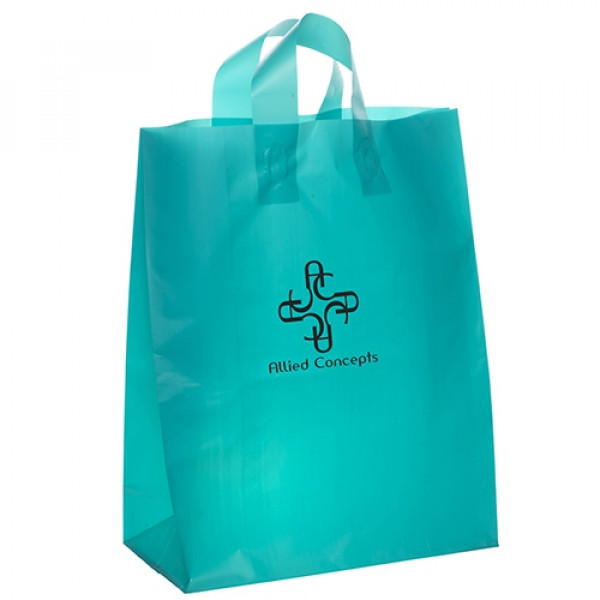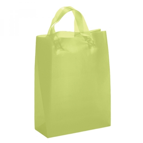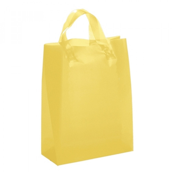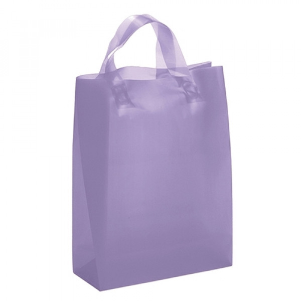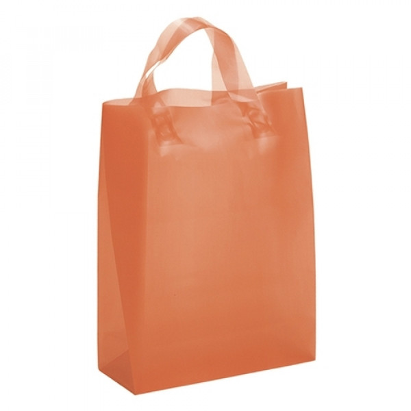 Hi-density 3.0 mil frosted color plastic bag with fused loop handle and cardboard bottom insert.