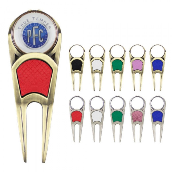 ::Ergonomic bent green repair tools with Lite Touch textured insert::1" Medallion ball marker is held securely with our rare earth magnet, yet releases with the push of a finger::Durable epoxy dome keeps logo protected::Includes sturdy pocket clip