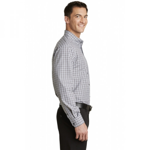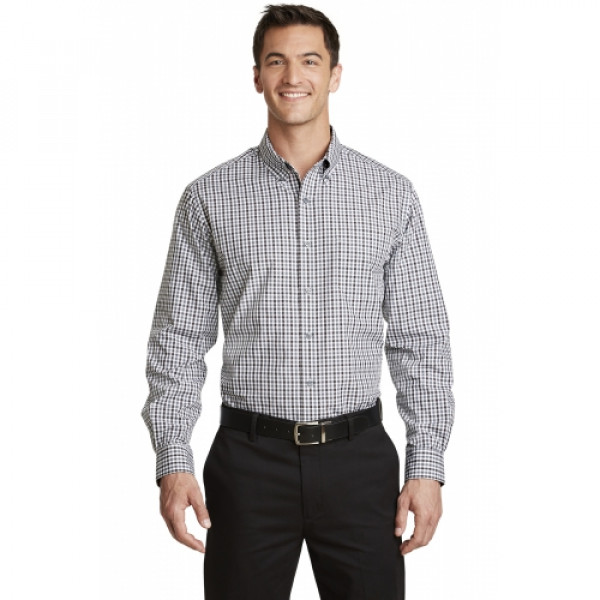 A fresh alternative to a solid-color shirt, our gingham check pattern is office-ready. Crafted in an Easy Care blend, this poplin style resists wrinkles and features bias-cut details.::3.2-ounce, 60/40 cotton/poly::Button-down collar::Pearlized buttons::Back box pleat::Left chest pocket::Mitered adjustable cuffs