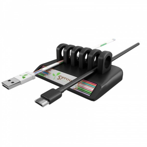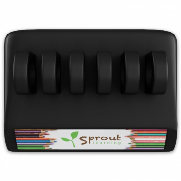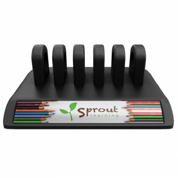 Brandable, clean, organized, and adhesive-free this desktop cord organizer features a perfectly angled decoration area, a sturdy weighted base, and an impressive 6 loop, 5 cable slot design that holds multiple cords per slot. Its non-slip, rubber texture securely holds the cables in place, while an extra wide and thick base ensures stability and provides substantial full-color decoration area that keeps branding front and center.::Securely holds USB, AC adapter, firewire, ethernet, display and audio cables, etc.::Great for use in the office or on a nightstand::Heavyweight construction ensures a secure, stable base::Full-color decoration::All-day brand visibility