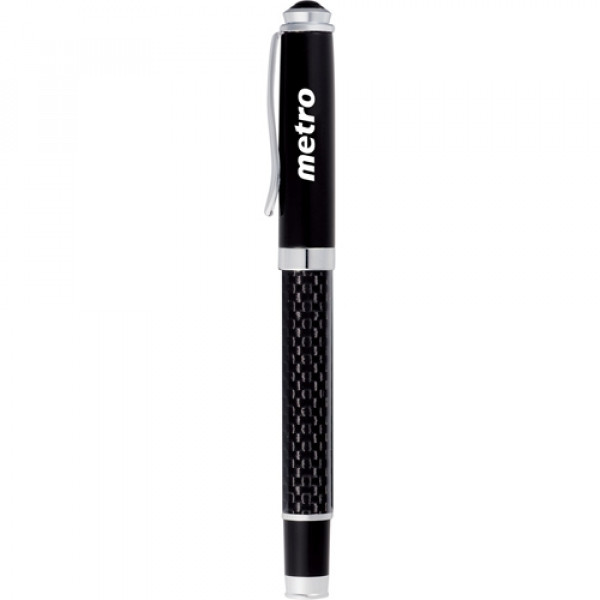 ::Cap off design with gloss black enamel upper barrel with carbon fiber detailing in lower barrel. ::Highlighted with chrome accents. ::Pen includes premium black roller ball ink cartridge.