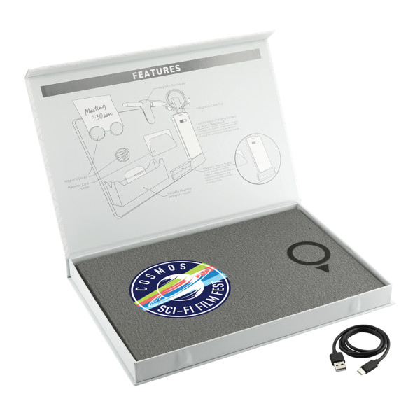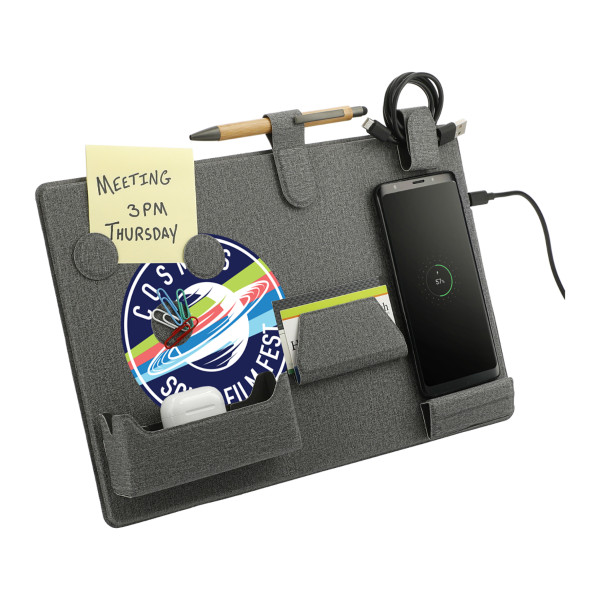 A sleek desk organizer with built‑in fast wireless charging and modular magnetic docks—a versatile workspace essential. This promotional product can be custom branded or decorated, blending productivity with your logo front and center.