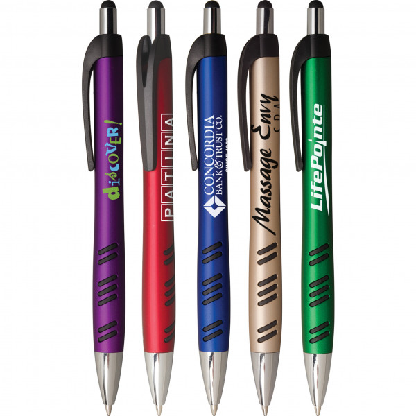 The ultramodern stylus pen combines sleek design with practical functionality, making it an ideal promotional product that can be custom branded for your next marketing campaign. With its rich metallic finish and contrasting matte black and silver trim, this pen stands out in both style and performance. The jumbo hourglass shape and rubberized grip ensure all-day writing comfort, while the built-in stylus tip adds extra versatility for touchscreen use.