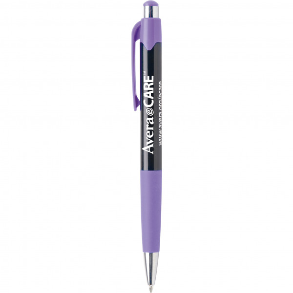 Add a bold pop of color to your next giveaway with this eye-catching retractable pen. Featuring glossy black barrels accented with vivid neon trim, this writing instrument combines bold style with everyday function. The generous rubber grip and ultra-smooth cartridge ensure a comfortable and consistent writing experience. A practical and stylish promotional product, it can be custom branded for your next event or campaign.
