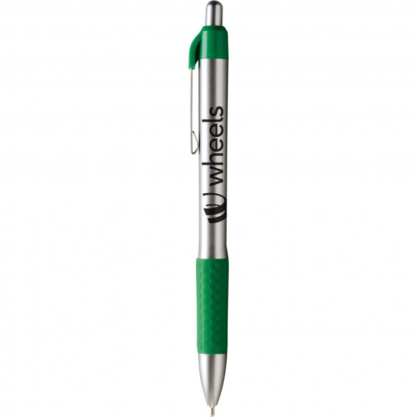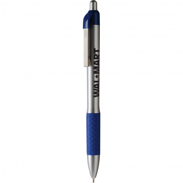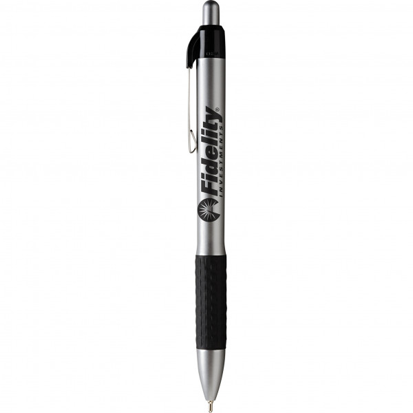 Enjoy a smooth writing experience with this stylish retractable pen featuring patented hybrid ink and a distinctive basket weave textured rubber grip. The brushed silver barrel with vivid trim and metal clip adds a professional touch, making it a great promotional product that can be custom branded for your business or event. Choose between blue or black ink, with black ink offering anti-fraud protection for added security.