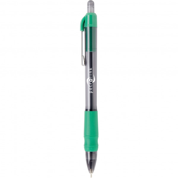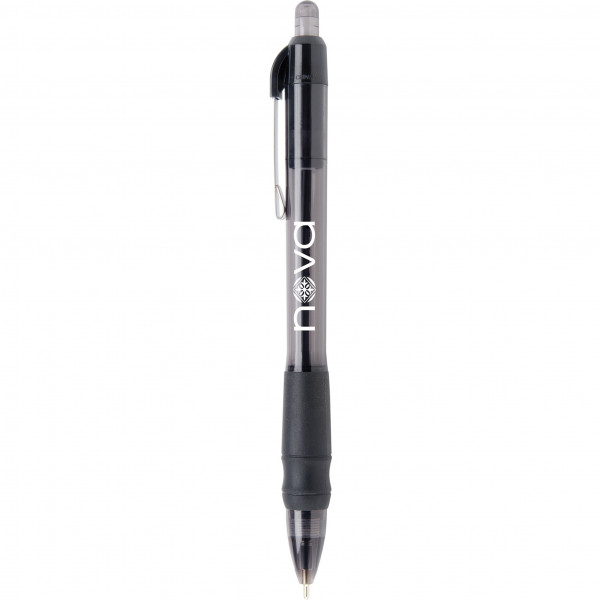 Experience smooth, effortless writing with this stylish pen featuring a patented hybrid ink formula and a unique rubber comfort grip. The translucent black barrel paired with corporate-colored trim and a sleek metal clip offers a modern look that’s ideal for everyday use. A great promotional product, this pen can be custom branded to leave a lasting impression.