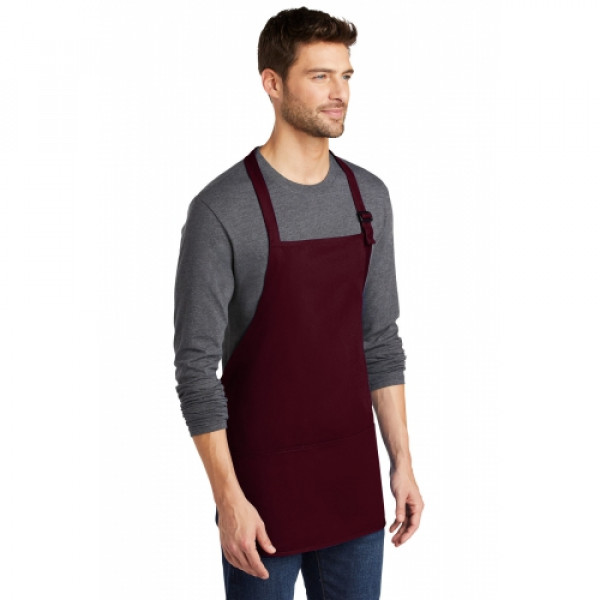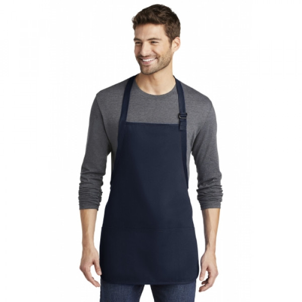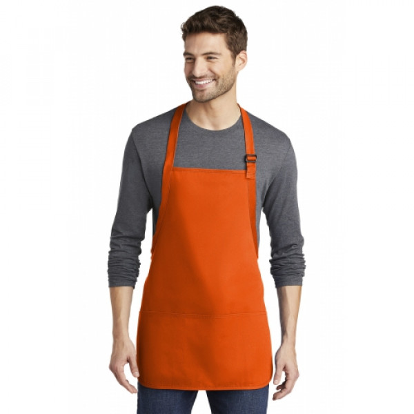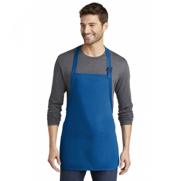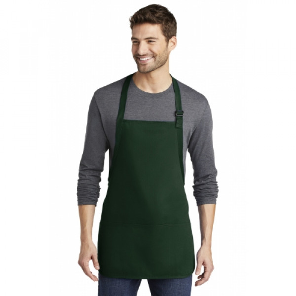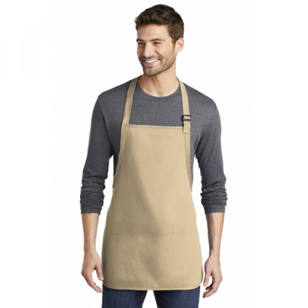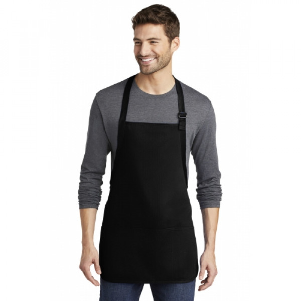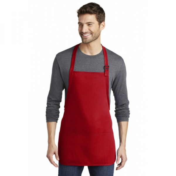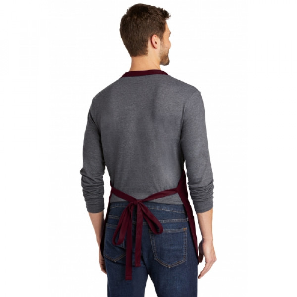 This versatile apron offers stain-release protection.::7-ounce, 100% cotton twill with stain-release protection::Three pouch pockets, pen pocket::1-inch wide neck and waist ties, adjustable neck strap::Measures 22" W x 24" L