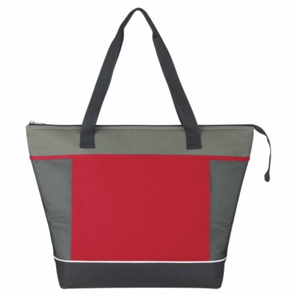 The Mega Shopping Cooler Tote features a top zippered closure, front pocket with Velcro® closure and 28" nylon handles. ::Spot Clean/Air Dry::Made Of Combo: 600D Polyester And Dobby Non Woven::PEVA Lining::28" Nylon Handles::Up to 5,000 stitches, 7 colors on 1 location.