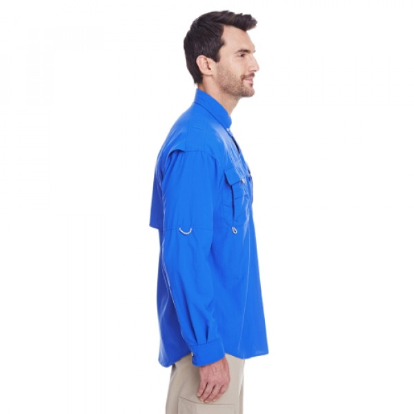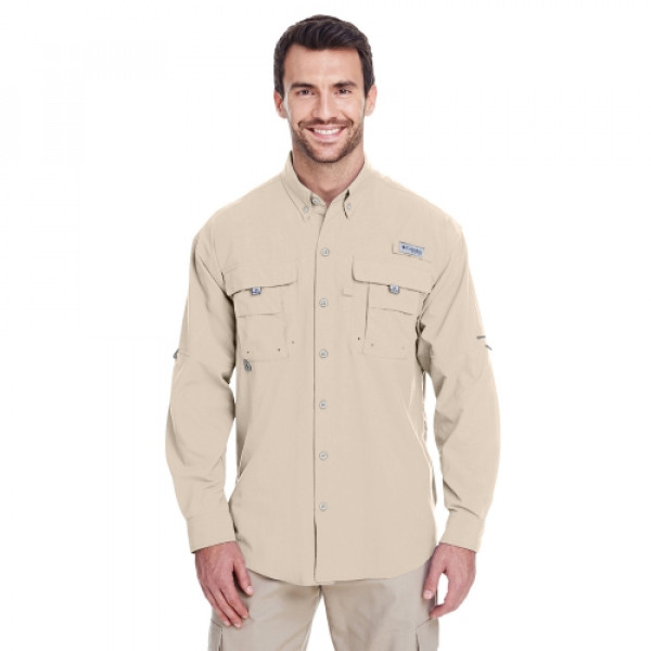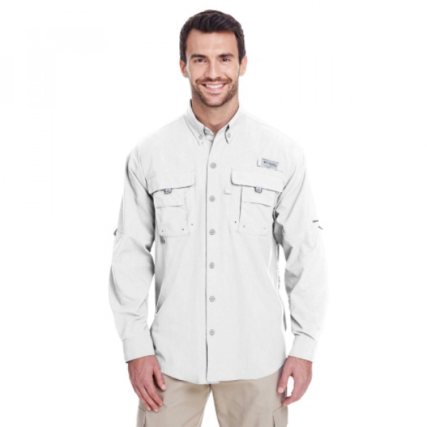 ::3 oz., 100% Tactel® nylon taffetta back country cloth::Quick dry::Omni-Shade™ UPF 50 sun protection::Performance fishing gear::Button-down collar::Roll-up sleeves with tab holders::Vented::Utility loop::Columbia PFG logo patch on rod holder on left chest::Embroidered Omni-Shade logo on upper left sleeve::PFG logo patch on center back