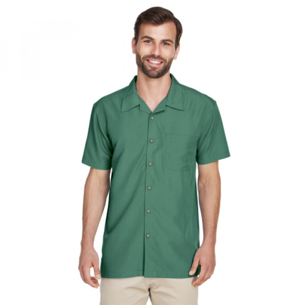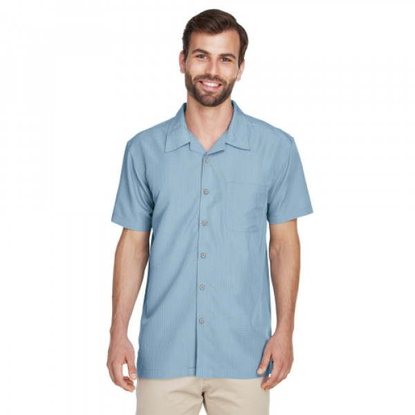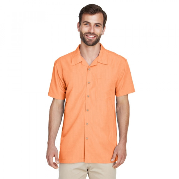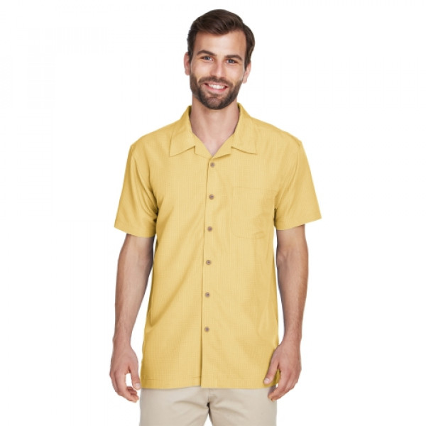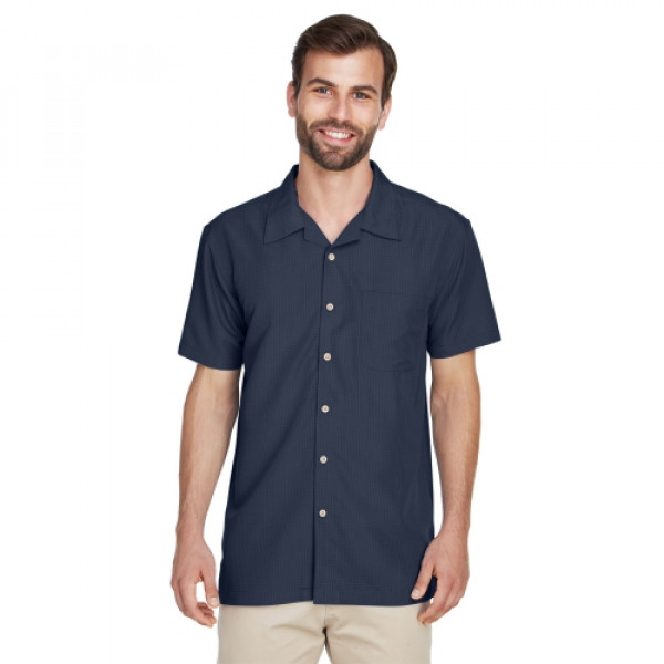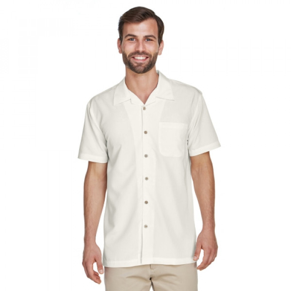 ::4.7 oz/yd2 / 160 gsm, 70% rayon, 30% polyester polynosic::Wrinkle-resistant::Sand washed for softness::70% rayon, 30% polyester::Short-sleeve camp shirt with special shadow weave::Full-button front::Synthetic coconut shell buttons::Replacement buttons::Side vents::Left-chest pocket