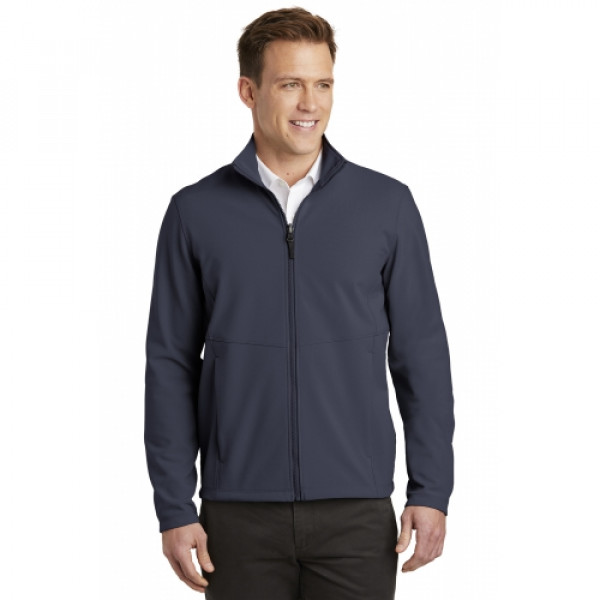 With a subtle mini ripstop texture, this sophisticated soft shell has double-needle stitching throughout and sleek design lines. The water-resistant film and DWR finish combine to resist wind and rain for weather protection. ::Can be zipped in and secured by snap attachments inside an outer Collective layer::94/6 poly/spandex woven mini ripstop with a DWR finish bonded to a water-resistant film insert and a 100% polyester brushed tricot interior::1000MM fabric waterproof rating::1000G/M2 fabric breathability rating::Slightly longer length::Vislon® center front zipper::Front reverse-coil zippered covered pockets